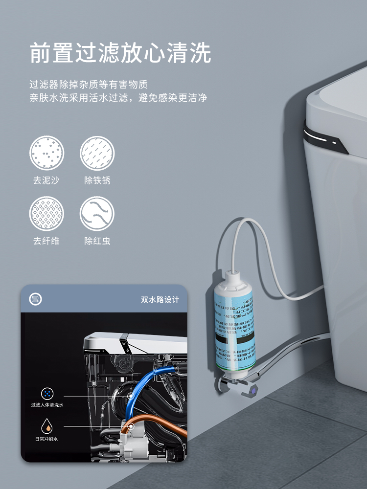 Dual waterway design: Filter human body cleaning water and Daily flushing water.