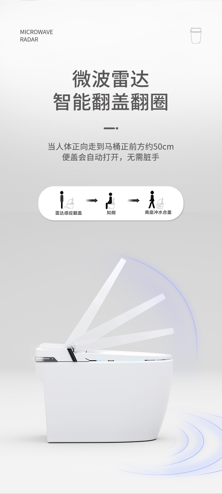 When people come close to the smart toilet, it will automatic open the lid; the foot sensor can open, close the seat ring, and flush.
