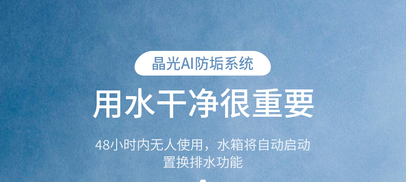 晶光AI防垢系统,用水干净很重要。48小时内无人使用,水箱将自动启动置换排水功能,自动换水。