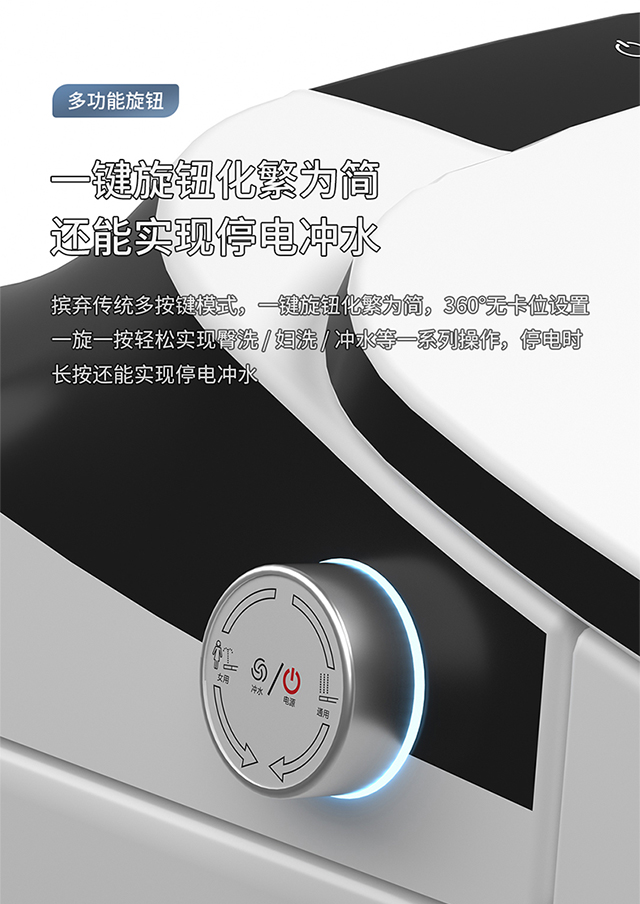 Rich functions button knob on the side. Rotate to left to start women washing mode, rotate to right to start the clean buttocks mode, long-press to start dry air mode, press it to stop flush.